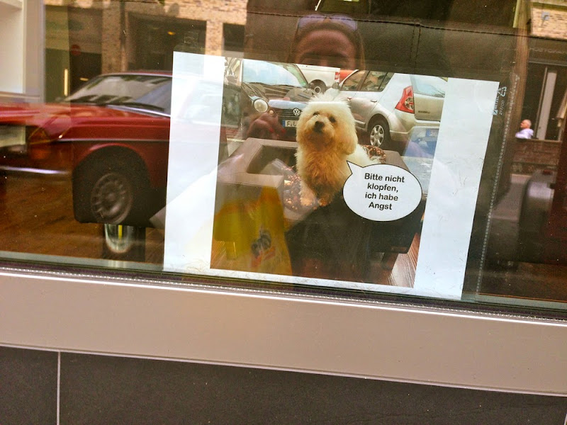 Jedes Mal, wenn ich auf meinem Weg in den Park an diesem Friseursalon vorbeitrabe, seh ich das Hündchen hinter diesem Schild im Körbchen schlafen und denke:
